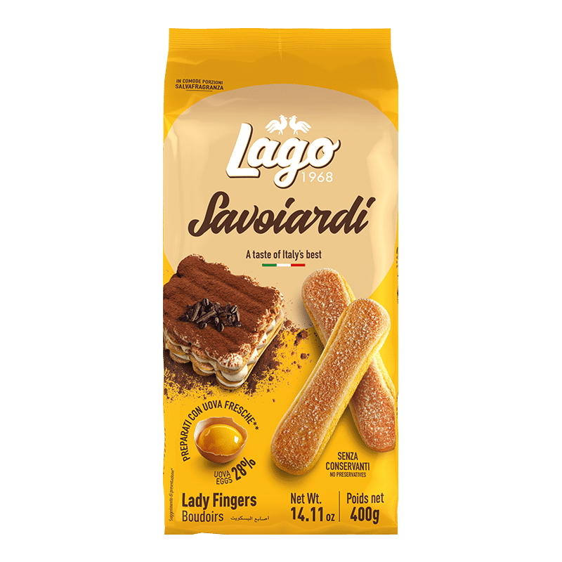 Les boudoirs LAGO sont des biscuits secs, légers et délicatement sucrés, parfaits pour accompagner un café ou pour réaliser de grands classiques de la pâtisserie comme le tiramisu, la charlotte ou les desserts à base de crème.